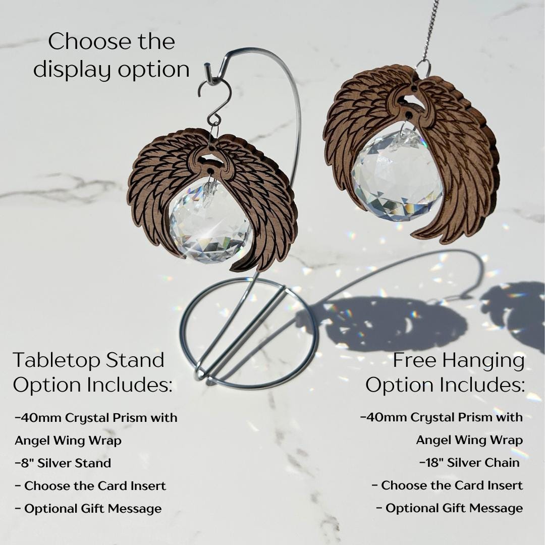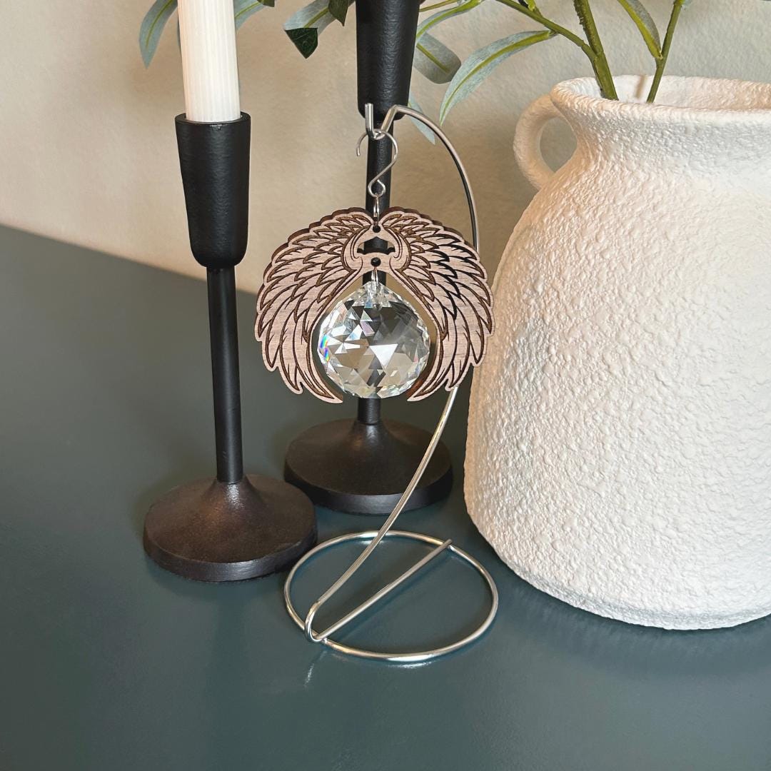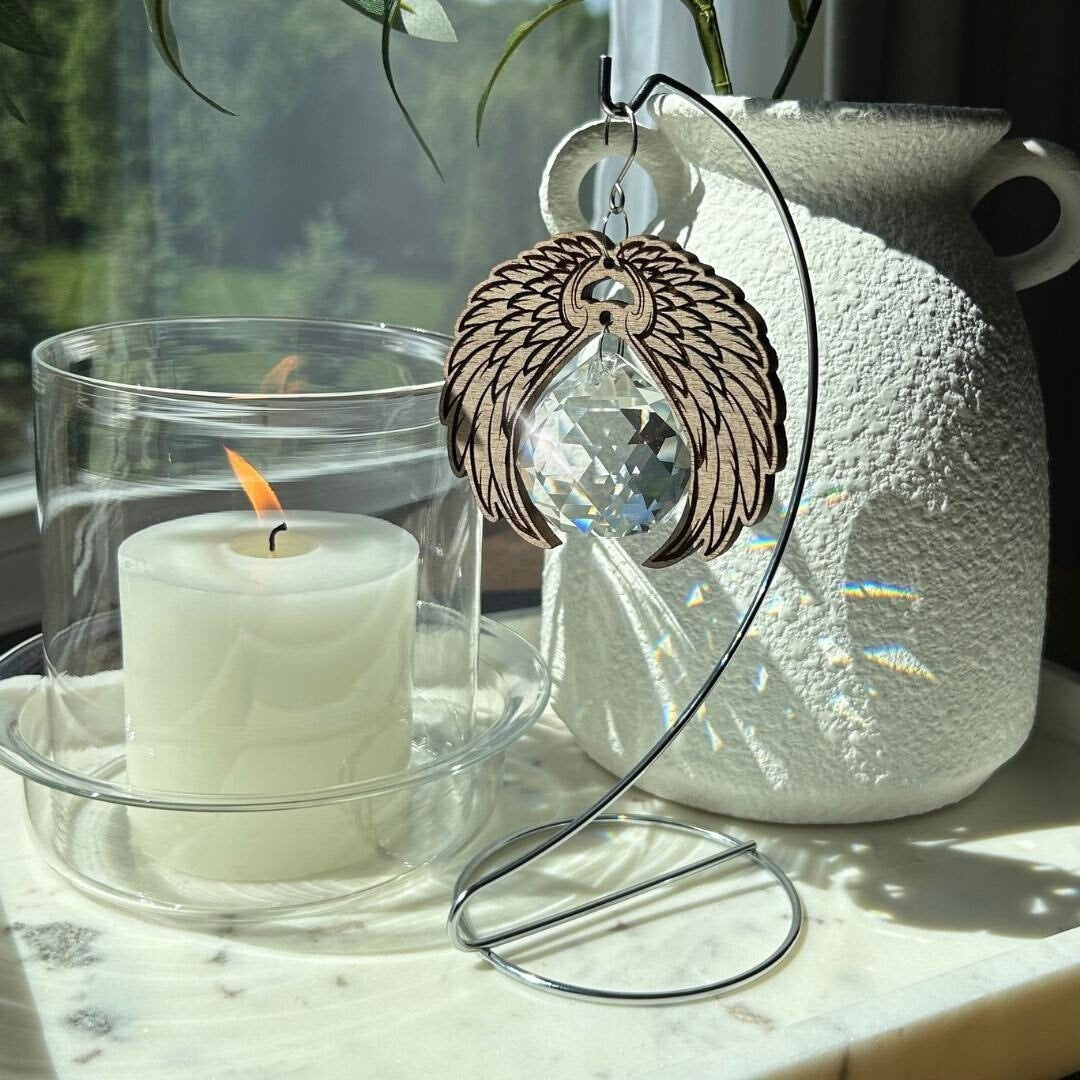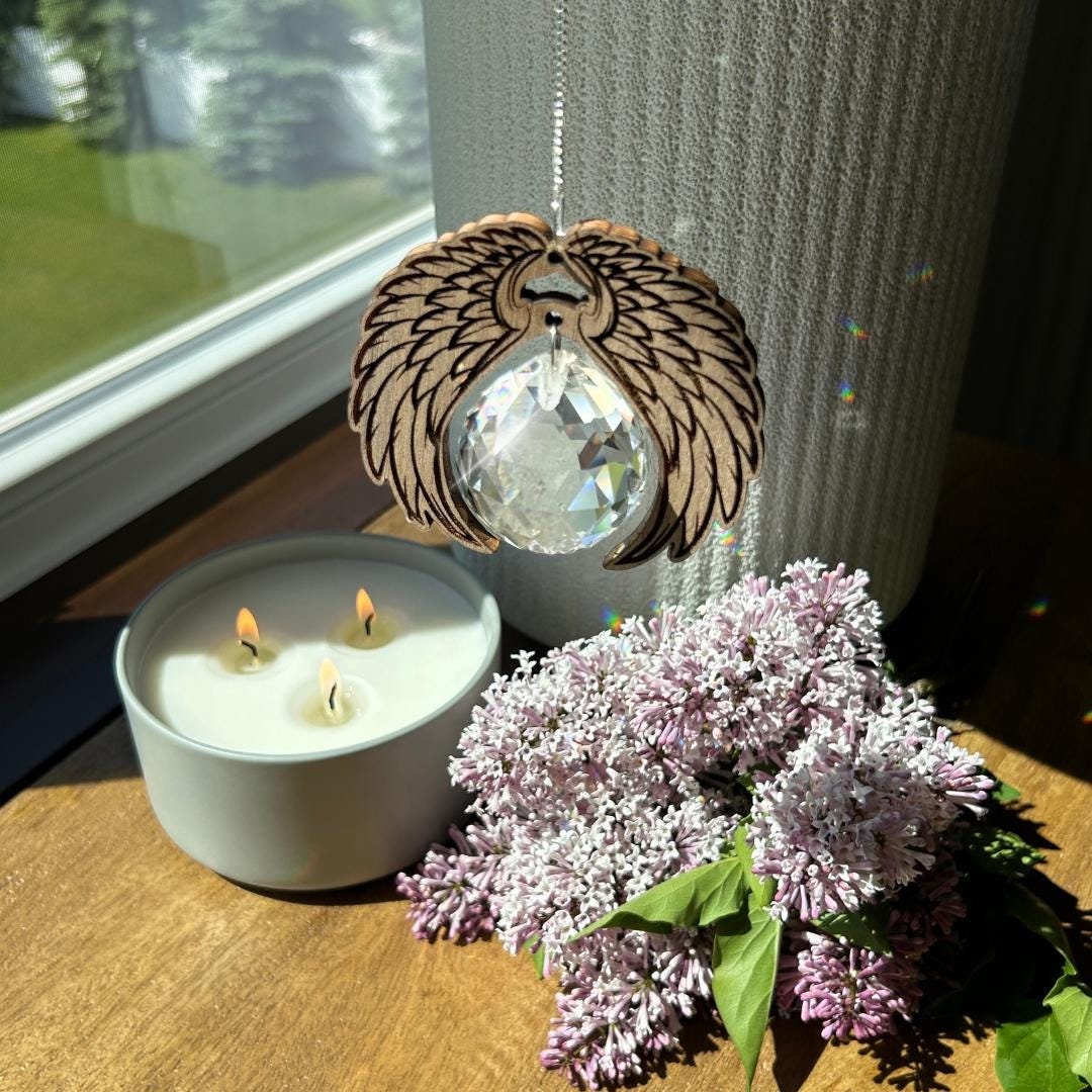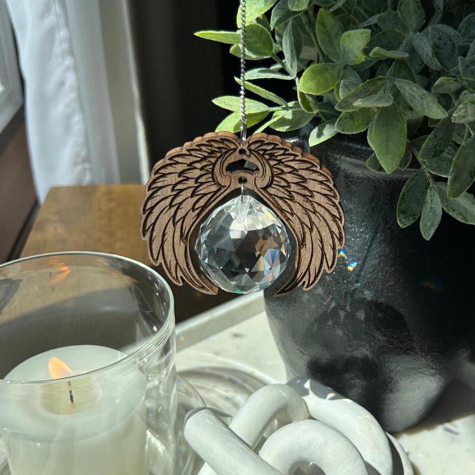 🔆One 40 mm (1.5") clear crystal ball prism surrounded by angel wings 〰️The crystal suncatcher is made of K9 advanced glass known for its elevated refractive index and enhanced transparency, ensuring an optimal display of vibrant rainbow patterns when exposed to direct sunlight.